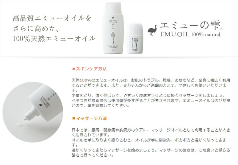 商品名 エミューの雫 エミューオイル100% 内容量 72ml 商品サイズ W51×H122×D25(mm)/85g 原材料 エミュー油100% (保存料・着色料・化学添加物は一切使用しておりません) ご使用方法 ●常温でよく伸びますので、まずはパール大の大きさを手のひらに薄く取り、乾燥やハリが気になる箇所に優しく伸ばしてください。